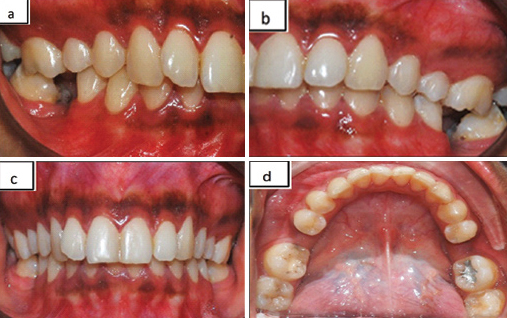 A 12-year-old female patient: a) with end on molar relation on right side; b) lingually tipped mandibular first molars bilaterally; c,d) posterior scissor bite on left side and deep bite.