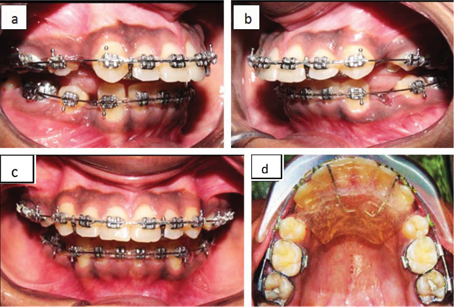 (a,b) After delivery of the anterior bite plane in the upper arch; c,d) sufficient clearance attained to upright the mandibular molars.