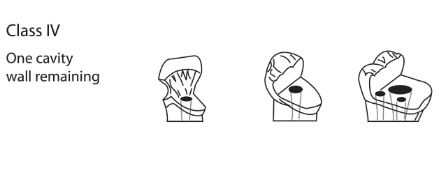 A dowel should be inserted if only one cavity wall is remaining. Fiber dowels are preferable in anterior teeth, but in posterior teeth, fiber or metal dowels can be used. The core can be made of composite or as a cast post and core. The definitive restorations should be crowns in anterior teeth and crowns, onlays or overlays in posterior teeth [5].