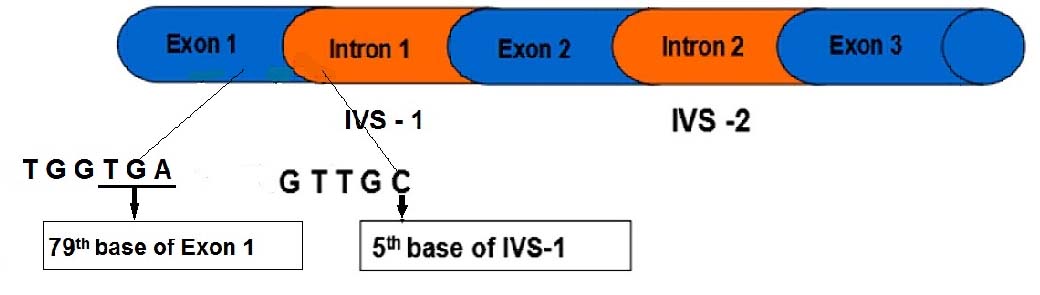 Sample exhibited only HbE trait. The son had this transmission, i.e., HBB c.79 G>A (HbE) and HBB c.92 +5 G>C (β+) from father and mother respectively and may require periodic blood transfusion as it had high HbE levels and altered normal Hb level (6.25 g/dl) along with red cell markers like MCV and MCH percent values as mentioned above. Clinician also suggested thalassaemia intermedia condition for periodic blood transfusion due to its probable severs condition. This kind of E/β compound heterozygosity is rare in Western India except one case in Gujarat [9] as for our knowledge is concerned in literature. But our case is the first to report from Rajasthan state reflecting its low incidence in this region too. Further, it is recommended that HbE/β thalassaemia patients do exhibit mild to severe anemic conditions variable from patient to patient availing periodic transfusions from childhood. It follows pedigree analysis showing autosomal recessive inheritance pattern [Table/Fig-3]. Molecular analysis indicated that both mutations of HbE and β thalassaemia in proband (son) are presented in Exon1 and Intron 1 of HBB gene whose segregation is slow probably for its low frequency [Table/Fig-4].