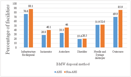 This study provides the overview of BMW management at the country level. The situation is worrisome across the health facilities. The BMW disposal infrastructure is not in place and proper guidelines are not being followed across the health facilities in both AHS and non-AHS states. The emphasis should be laid upon the provision of various infrastructure and equipment related to waste management. Also, hospital administration should conduct induction and refresher training sessions for the healthcare staffs so as to ensure the proper disposal of BMW.