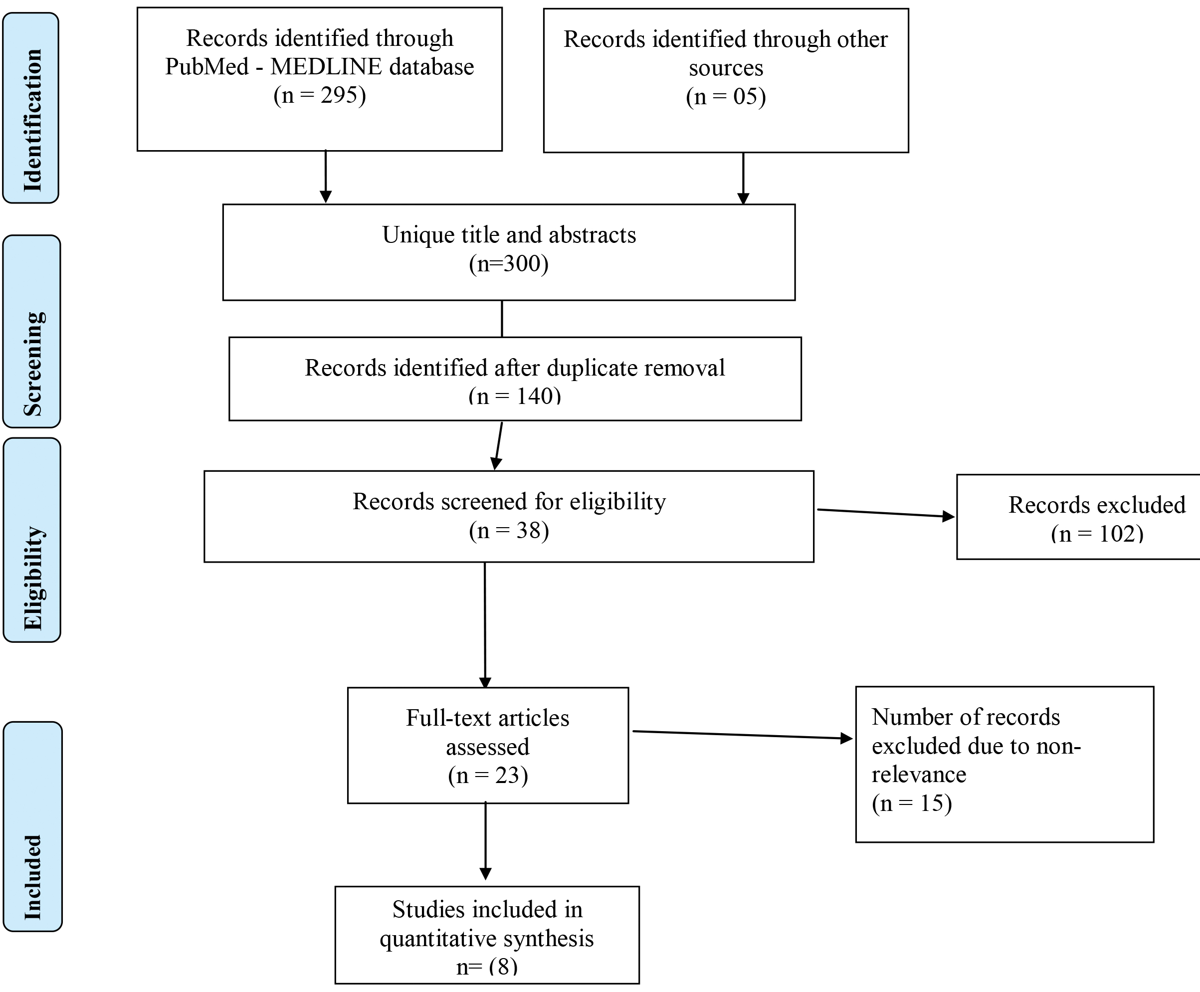 Preliminary screening identified 300 unique records, out of which 23 articles were selected by title and abstract [Table/Fig-1]. After full-text reading, 15 records were excluded. This exclusion resulted in eight full-text articles which were processed for data extraction. Additional hand searching of the reference lists of the selected studies yielded no additional records. An overview of the selected studies and their characteristics are presented in [Table/Fig-2] [11-18].