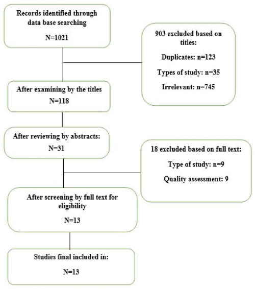 A total of 1021 records were identified from the electronic search of the databases. After exclusion by titles, types of study (the ones that were not clear to classify in terms of year limitation and language), irrelevant (the quality of studies, books and references was too low) and repeated articles, 118 articles were reviewed. At this stage, 903 articles were excluded. After reviewing by abstract, 31 articles were included in the study. After full text review, according to PRISMA checklist, 18 articles were excluded after considering type of articles and quality assessment. Finally, 13 papers were investigated for inclusion in this systematic review [Table/Fig-1]. Then assessment and data synthesis were performed to obtain the key results presented and summarised in [Table/Fig-2].