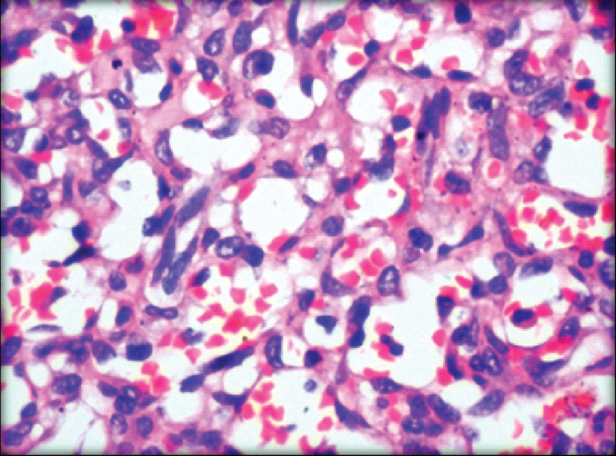 Angiosarcoma of the breast is a rare tumour with a reported incidence of only 0.04% of all breast malignancies. A 34-year-old lady presented with a lump in her right breast. In view of haemorrhage and few stromal fragments on Fine Needle Aspiration Cytology (FNAC), a diagnosis of phylloides was given. Simple mastectomy was done which showed a tumour with areas of haemorrhage. On microscopy anastomosing irregular vascular channels filled with RBC’s were noted. Sheets of tumour cells with high mitotic activity was observed at places. There were areas of haemorrhage and ischaemic necrosis. A diagnosis of angiosarcoma was made which was confirmed by immunohistochemistry (CD 34 and factor VIII). Eight months later she presented with a recurrent lump in her right chest wall following which lumpectomy was done. Microscopy showed similar features as in the earlier mastectomy specimen. On reviewing the fine needle aspiration slides we realised that the endothelial fragments were mistaken for stromal fragments.
