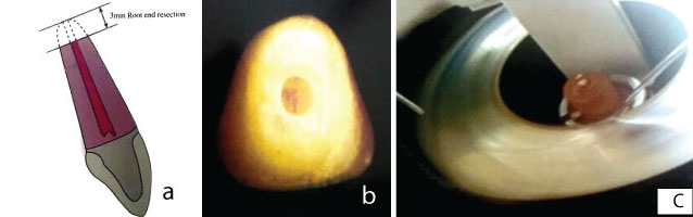 Showing sample cavity preparation in three groups depending on depth of cavity a) root end resection b) retrograde cavity preparation c) sectioning of root using hard tissue microtome.