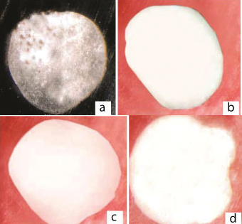 Degrees of dye penetration for apical microleakage in group-1 using MTA at each mm sections of cavities 4 mm in depth. a) MTA section-1, score-1 b) MTA section-2, score-0 c) MTA section-3, score-0 d) MTA section4, score-0