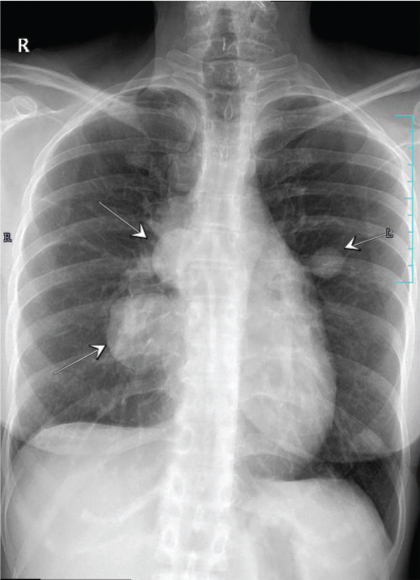 Bilateral canon ball lesions in lungs clearly visible in chest X-ray (marked by white arrows).