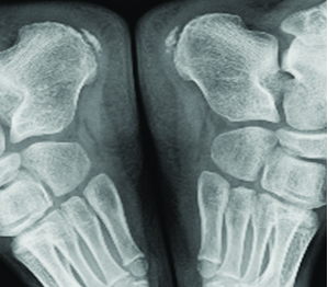 The physical examination at the final presentation to the hospital revealed a calendar age of 13 years 1 month, height 141 cm (-2.06 SDS) body weight 28.4 kg (-2.62 SDS), weight according to height 81%, and testis volumes of 5/5. There was pain in both heels increasing with palpation but with no increase in temperature, hyperaemia or swelling. He could not put his weight on his heels when walking. Laboratory tests revealed haemoglobin 13.4 gm/dL, leukocytes 5420/μL, and thrombocytes 218.000/μL with no atypical cells in the peripheral smear. The lateral foot graph revealed a sclerotic and fragmented apophysis [Table/Fig-1,2]. The patients GH treatment was continued, and he was recommended bed rest and in case of excessive pain the patient was advised nonsteroidal anti-inflammatory drugs. Follow up was undertaken jointly with the Department of Orthopaedics. After three months of follow up the pain in both heels and limping was regressed.