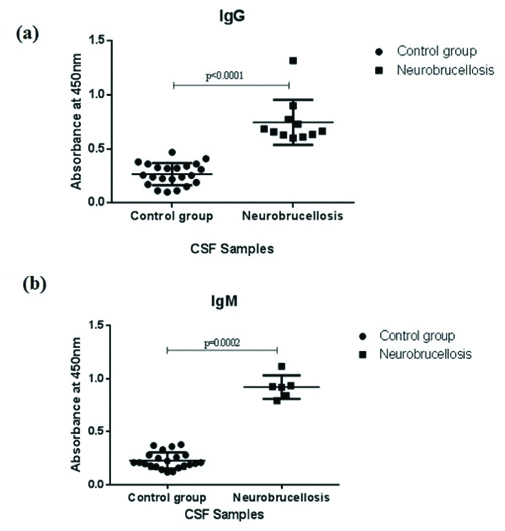 Scatter plots of the absorbance values of; a) IgG and b) IgM antibodies against Brucella in CSF samples of control group and neurobrucellosis patients respectively.