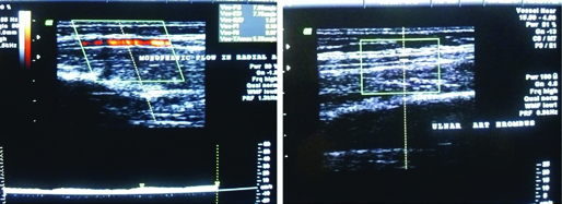 After 10 days of enucleation, the patient presented with multiple episodes of convulsions and vomiting which were not associated with fever. Cardio-respiratory and neurological examination were normal. The peripheral pulses in all limbs were equally palpable. Clinically suspecting increased intracranial pressure patient started treatment empirically with mannitol and phenytoin. Patient improved symptomatically within 48 hours of admission and on day 3 of admission, the patient developed pain and bluish discolouration of the digits of the left hand [Table/Fig-3,4]. The left hand was less warm than the right. The left radial pulse was not palpable. The child did not have a history suggestive of collagen vascular disease or Raynaud’s phenomenon in the past. Color Doppler showed occlusion of radial and ulnar arteries of the left limb [Table/Fig-5].