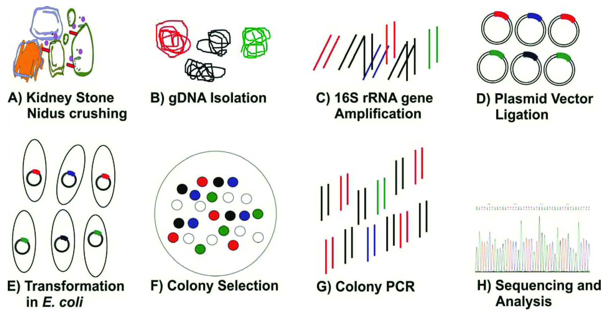 Previously, the urinary tract was considered to be sterile; however, urine culturing protocols and Next Generation Sequencing (NGS) techniques proved the presence of microbes in urine [3]. Knowledge about the bacterial invasion and/or localisation inside the CaOx stones is very scanty. The exploration of bacterial imprints inside the kidney stones has been getting the attention most of the researchers across the globe and methodologies mostly acquired, are direct detection methods such as cultivation and microscopy. The present study aimed at characterising the chemical composition of kidney stones and assesses total bacterial diversity in these stones using 16S rRNA gene clone library approach. The present study involved in the identification of bacterial composition of kidney stone and also in understanding their putative metabolic activities involved in pathophysiology formation of kidney stone.