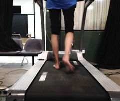 Participant with wireless sEMG for testing peroneus longus muscle activation in stance phase of gait.