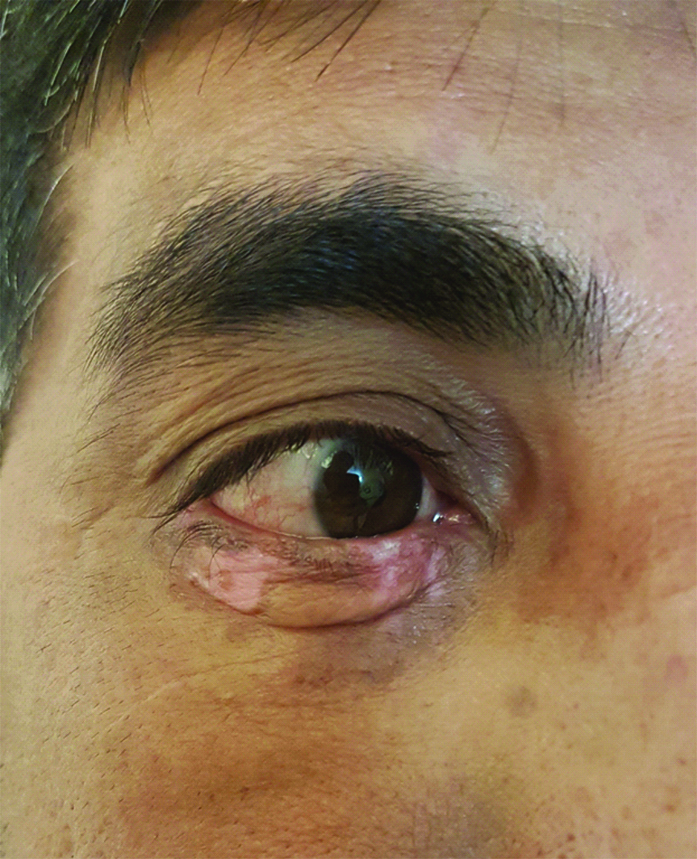 A 42-year-old man presented to the clinic of Dermatology and Hair Transplantation, with a two-year history of right eyelid scarring and associated eyelash alopecia. Upon initial presentation of the patient’s symptomatology, he had a positive smear test for leishmania. Therefore, he was diagnosed and treated for eyelid leishmaniasis with several rounds of cryotherapy and glucantim for two years; his lesions were refractory to this initial therapy.