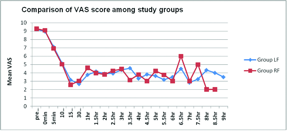 The baseline mean VAS scores were comparable (9.23±0.81 in LF group, 9.3±1.26 in RF group). There was a fall in VAS score in both the groups after onset of analgesia in first 15 minutes, thereafter VAS score remained stable and comparable in both the groups [Table/Fig-6,7].