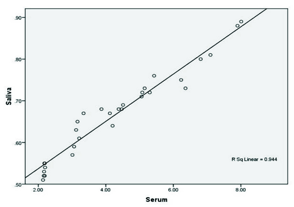 Human saliva is a plasma ultra filtrate containing proteins derived from blood or from salivary glands. Saliva also plays an important role in maintenance of oral tissues [11]. Compared to serum, saliva demonstrated more accurate, inexpensive, and convenient results.