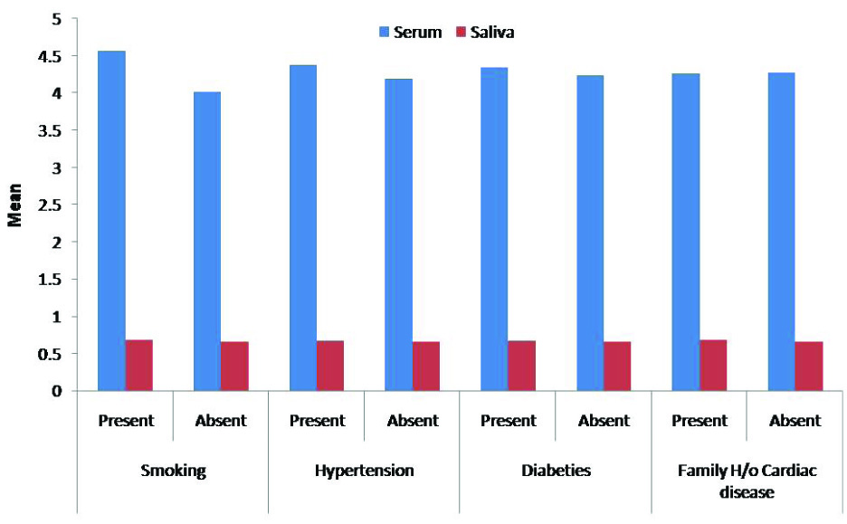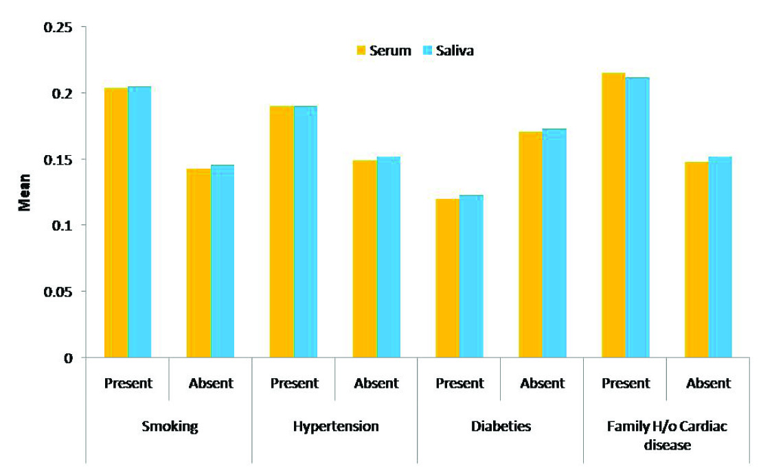 On further analysis, we found that in group I (cases), none of the parameter showed statistical significant difference between absence and presence of disposing factors in salivary and serum cardiac troponin-I levels However, in group II (controls), statistical significant difference was observed in cTn I levels of subjects with and without smoking, diabetes and familial history of cardiac disease. In control group, we also noted that the levels of cTn I decreases in all variables except in diabetic patients where the level of cTn I are more in non diabetic patients.