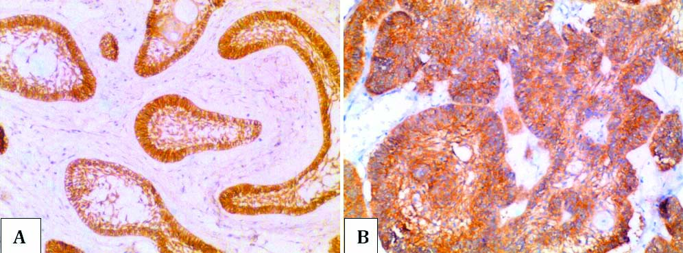 a) Positive EGFR expression (Score 2) in ameloblastoma in case no. 8 (20X magnification); b) Positive EGFR expression (Score 2) ameloblastic carcinoma in case no. 16 (20X magnification).