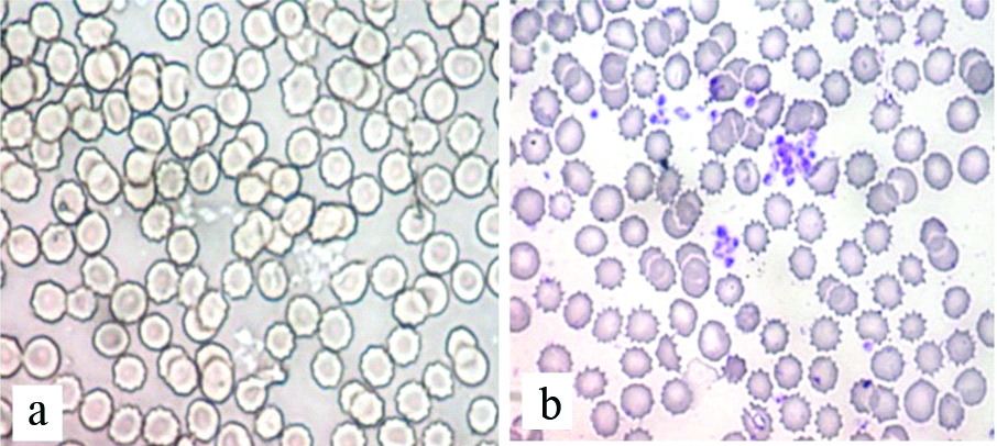 a) Unstained smear shows presence of three variable size clumps of platelets (Unstained smear, 100X); b) Smear stained by Wright stain further confirmed the findings (Unstained smear, 100X).