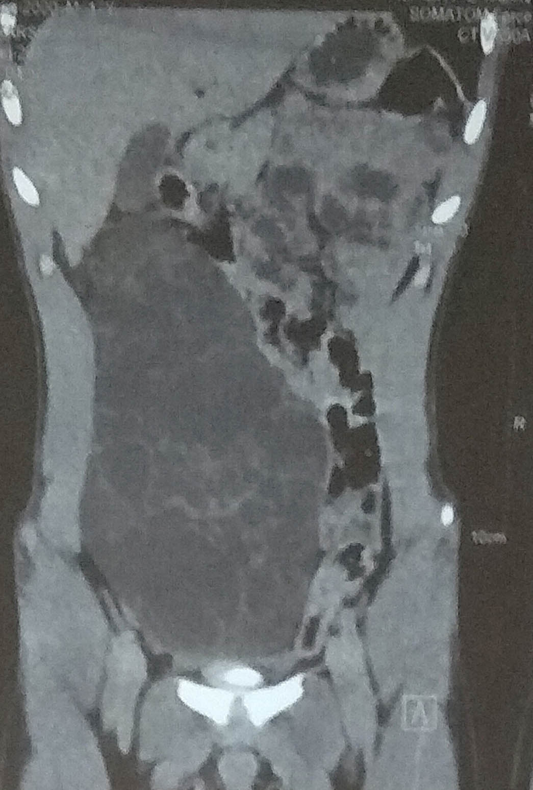 CECT showing a well-defined multiseptated cystic lesion in right side of abdomen with displacement of bowel loops.