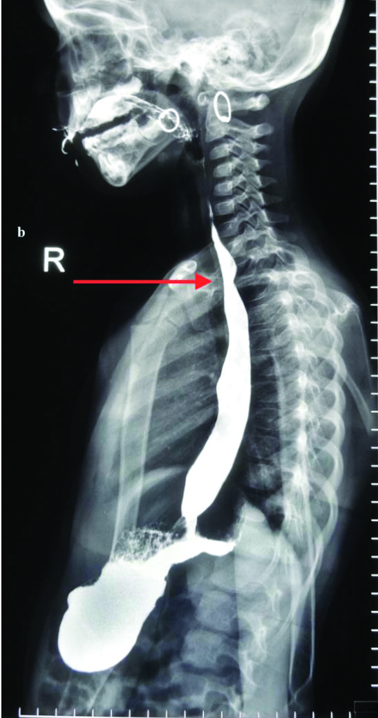 The twins were monozygotic and were weaned unsuccessfully at four months of age with semisolids. The first set of investigations included indirect and direct laryngoscopy, upper oesophago gastroduodenoscopy and oesophageal barometry but all test results were inconclusive. Computed Tomography (CT) and Magnetic Resonance Imaging (MRI) were also done and found to be inconclusive. Echocardiography was done to rule out any cardiac defects and was found to be normal. Finally, barium oesophagogram showed constant narrowing of the oesophagus at the level of the aortic arch without any evidence of mucosal irregularity. The narrowing had an oblique orientation from inferior left to superior right on the posterior aspect of the oesophagus. This was consistent with extrinsic compression by a retro-oesophageal aberrant right subclavian artery in both the patients [Table/Fig-1a,b]. Based on the above findings, operative repair was advised.