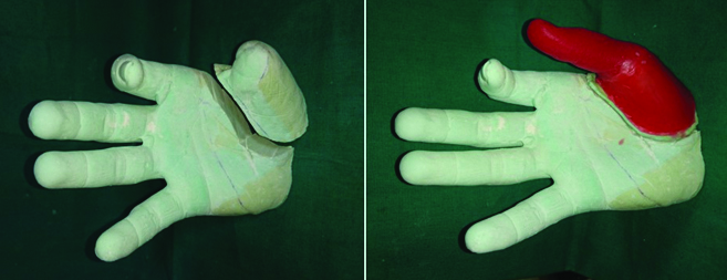 The rehabilitation of her thumb was challenging due to level and site of amputation. The patient was informed about both possible treatment options-surgical reconstruction and prosthetic rehabilitation. But, due to surgical trauma and financial constraints, the patient agreed to prosthetic rehabilitation. So, thumb prosthesis was planned for the patient. As the patient was unwilling for any surgery, implant retained prosthesis was ruled out. Mechanical retention with devices such as Velcro strap would be quite discernible for pollex location. Therefore, glove type thumb prosthesis with retention aided by an incorporated wire in the silicone prosthesis was planned to work in harmony with the flexed osseointegrated index finger of the right hand.