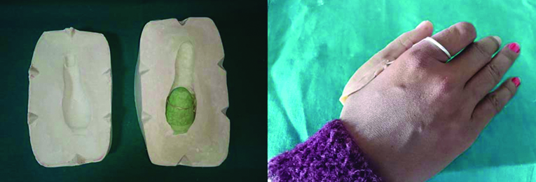 Patient was informed about the procedure and her consent was obtained. An impression of the right amputated thumb stump was made using irreversible hydrocolloid impression material (Zelgan) and poured with Type-III dental stone (Kalstone, Kalabhai Pvt., Ltd., Mumbai, India) to obtain the working model [Table/Fig-2]. Then 1 mm reduction was done all around the thumb stump to enhance fit to the elastic silicone prosthesis. After that, an impression of the patient’s left thumb was made with alginate and poured in molten modelling wax (Link dental modelling wax no. 2, MDM Corporation, Delhi, India). This wax pattern of the left thumb was adapted to pollex stump model [Table/Fig-2] and the borders were merged with the area adjacent to the defect site. A 20 gauge silver wire was incorporated into the wax pattern as an aid for mechanical retention of the prosthesis. It was adapted at the root of the stump extending upto the metacarpophalangeal joint of the index finger, attaching to a ring worn on the index finger [Table/Fig-3]. Fabrication of silicone prosthesis with incorporated wire to aid in retention is hardly documented. Anatomic crease lines were carved to give a more natural appearance. Then, the wax pattern was tried on the patient’s hand [Table/Fig-3]. Along with the shape and size, the fit, orientation, emergence and borders of the pattern were evaluated.