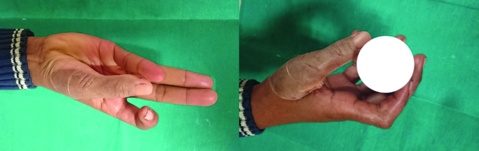 Physical and antero-posterior radiographic examination of right hand revealed amputated thumb at proximal phalanx [Table/Fig-1]. The index finger was osseointegrated at the interphalangeal joint of distal and middle phalanx in the flexed position because of an attempt to reattach the distal phalangeal portion at the time of injury. The patient was naturally not able to straighten the index finger [Table/Fig-1]. The skin of the amputated finger was completely healed.
