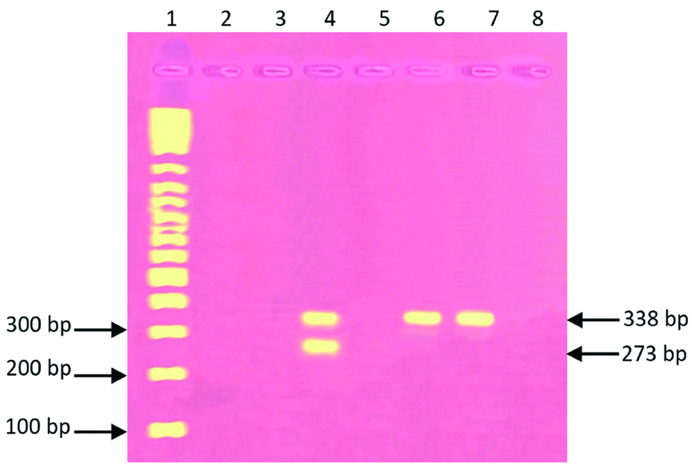 Electrophoresis patterns corresponding to migration of different alleles of TPMT analysed by Allele-Specific Multiplex PCR. Lane 1 showed a 100 bp DNA ladder on a 2% agarose gel. Lane 4 shows two fragments of 338 and 273 bp corresponds to TPMT*3A polymorphism. Lanes 6 and 7 show a single fragment of 273 bp corresponds to TPMT*3C polymorphism. Lane 2, 3, 5 and 8 show no PCR fragments.