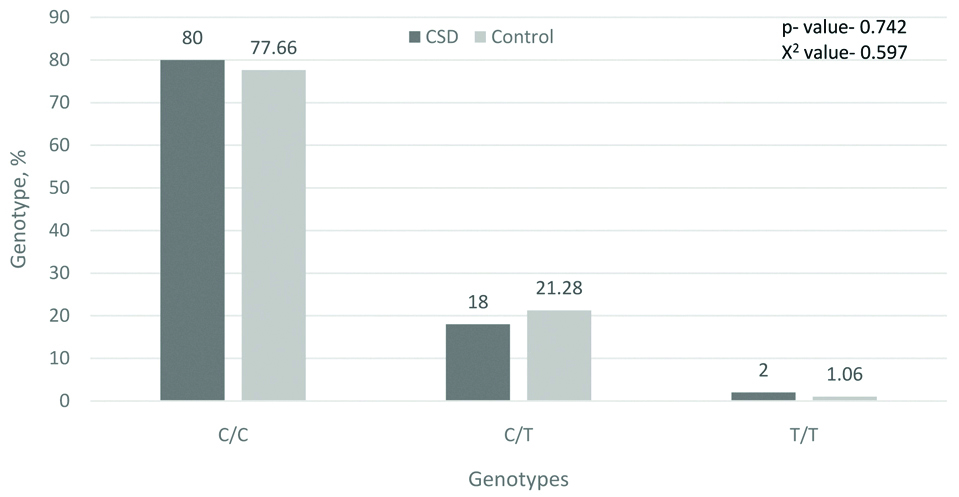 From the literature data it is known that the presence of the C-allele characterises the slow metabolism of xenobiotics during induction with caffeine, omeprazole and smoking [22]. In our study, 55.8% of patients with CSD had an allele of a slow metaboliser, while in the control group this value was 48.09%[Table/Fig-3].