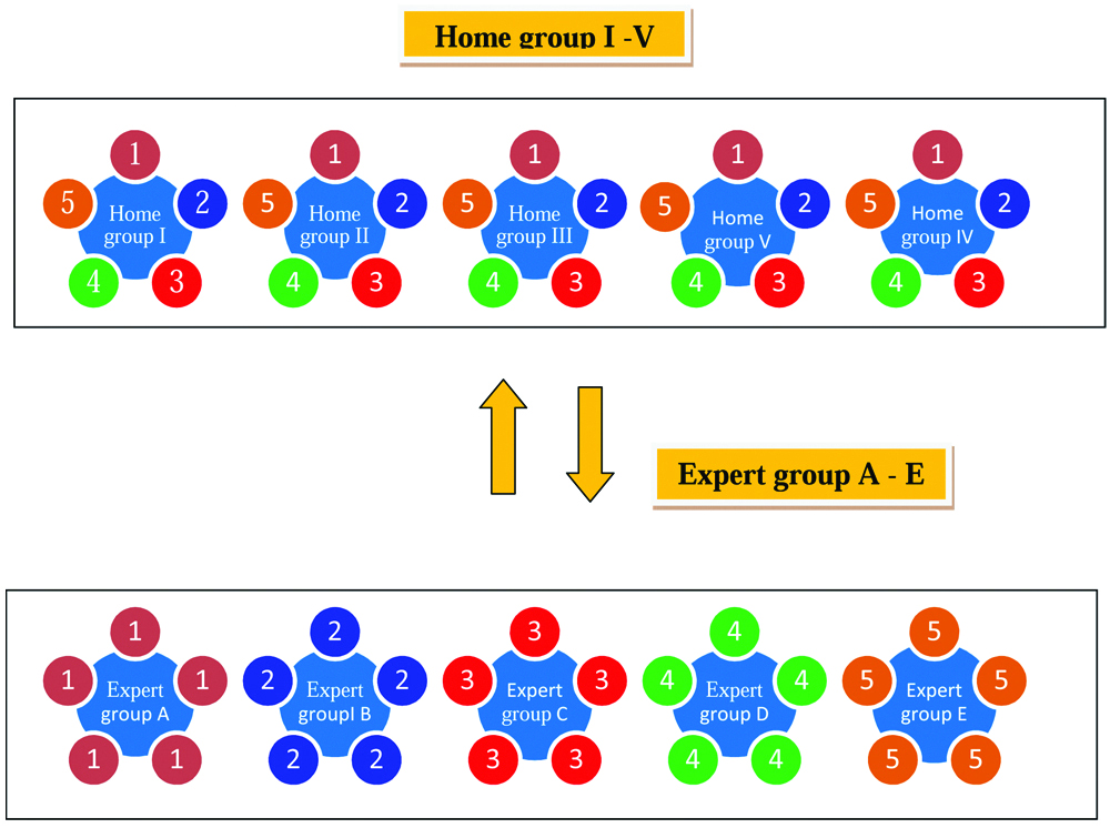 In this method of teaching, the topic is divided into many subtopics (jigsaw pieces). The students are divided into small groups called home group with each group member responsible for learning one subtopic. Students from different groups having the same subtopic meet and form expert group and learn together and become experts in that particular subtopic. The students return to their home group and each student teaches the part of jigsaw puzzle (subtopic) in which they have become expert, to the other members of the home group completing the jigsaw puzzle [8].
