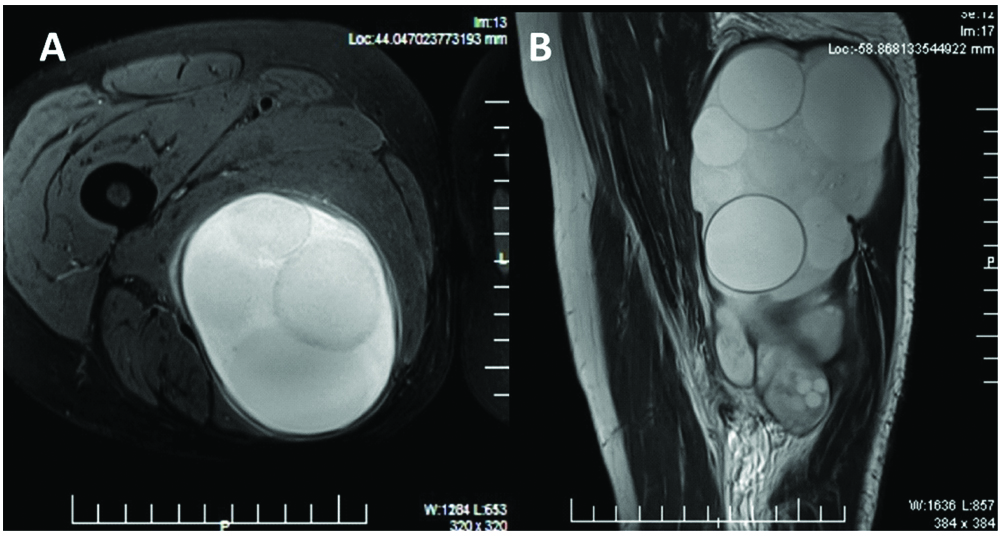 Initial laboratory results were normal except for haemoglobin level that was 10.4 gm%. Ultrasonography (USG) examination was performed using 10 MHz high-frequency probe, which revealed an approximately 19×19 cm sized multicystic hypoechoic lesion deep into the muscular layer of the posteromedial region of the right thigh. Multiple cysts of varying size and multiple small foci of calcifications were also noted. The underlying muscles appeared normal and no abscess was noted.