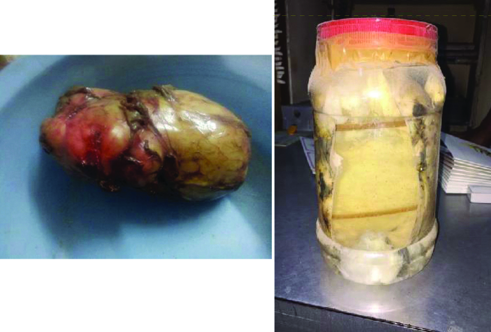 Histopathological examination confirmed the diagnosis of hydatid cyst. The gross description reported a large shaped cystic yellowish-brown soft tissue mass 14×10×8 cm oozing a milky white material on sectioning [Table/Fig-2]. Inner wall showed multiple tender coconuts like daughter cysts. No evidence of granuloma or malignancy was noted. The postoperative period was uneventful and the patient was discharged on oral cefpodoxime proxetil.