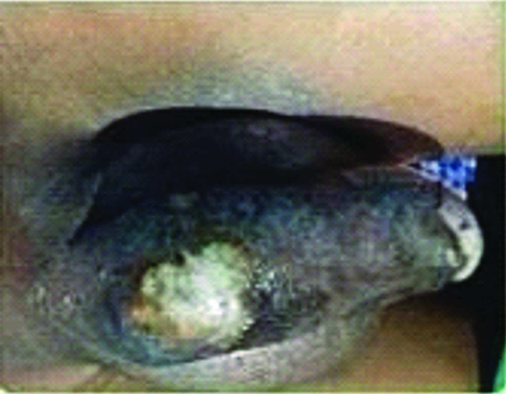 A 55-year-old male presented in emergency with complaint of blackish discolouration of penile skin since 10 days. He had no comorbidity and was non-smoker, non-alcoholic. The Patient was afebrile, pulse-98 beats/min, BP-110/70 mm of Hg, RR-14 breaths/ min. Examination of external genitalia showed blackish discolouration of skin of penis and gangrenous patch present on the shaft. There was no inguinal lymphadenopathy. The scrotum, testes, spermatic cords were normal. Digital rectal examination was normal. Laboratory investigation revealed- Hb-12 g/dL, Haematocrit-36%, WBC-17000/mm3, Blood urea-30 mg/dL, Serum creatinine-1.6 mg/dL, Na/K-133/3.5 mEq/L, RBS-130 mg/dL, serum bicarbonate-38 meq/L. Urine microscopy and culture showed no abnormalities, FGSI was two. Patient was put on broad spectrum antibiotics (intravenous amoxicillin and clavulanic acid combination 1.2 gm 8 hourly and injection clindamycin 600 mg 12 hourly) and taken for emergency surgical debridement [Table/Fig-6]. Following serial debridement and dressing, the wound was healthy and patient was discharged with advice.