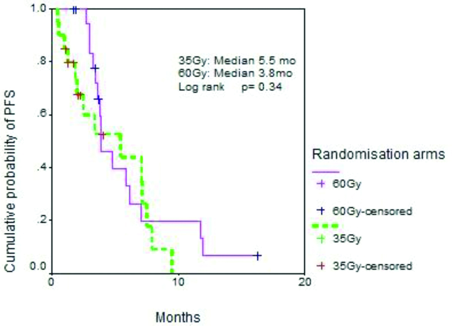 Phillips C et al., prospectively compared standard RT (n=32; 60Gy/30 fractions/6 weeks) with short course RT (n=30; 35Gy/ 10 fractions/2 weeks) in malignant gliomas with poor prognosis. The median survival was 10.3 months in the standard arm and 8.7 months in the experimental arm (p=0.37). Acute toxicities were mild and similar in both the arms. QOL comparison could not be made due to incomplete assessment [5].