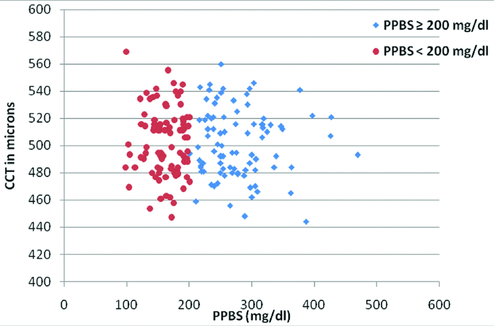 In the present study, no association was found between the amount of reduction in blood sugars and variation in CCT [Table/Fig-2]. There was no difference in the mean CCT in diabetics with PPBS over 200 mg/dL (501.38±25.28 μm) versus those with PPBS less than 200 mg/dL (502.20±25.05 μm).