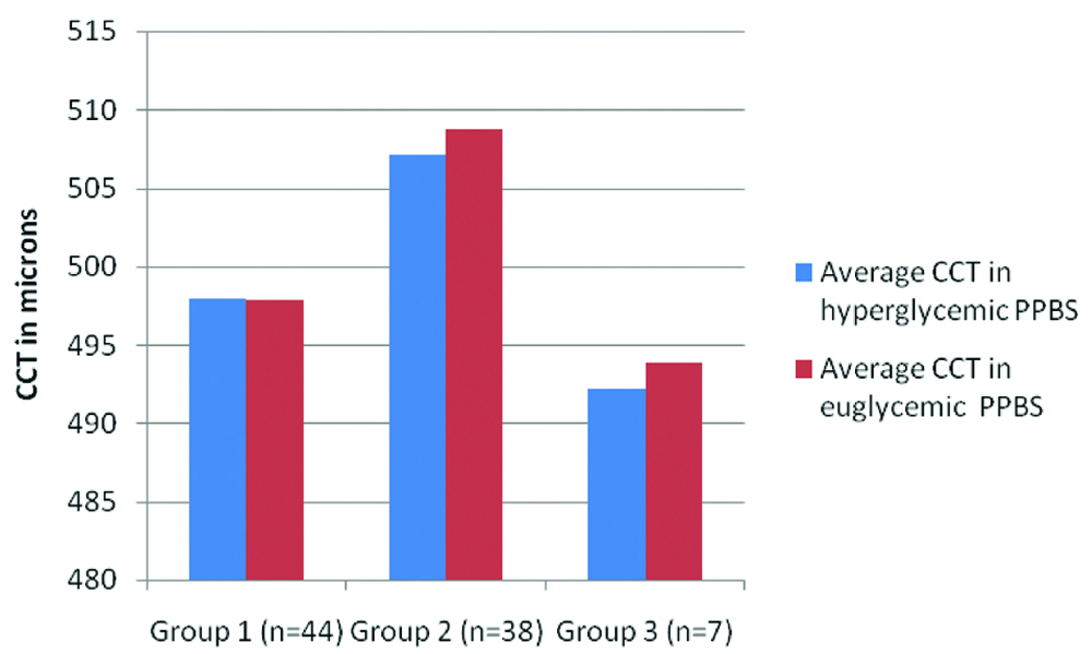Changes in CCT according to the magnitude of reduction in blood sugars was looked into [Table/Fig-3]. For this, patients were divided into three subgroups. Group 1 included patients who had a 50-100 mg/dL reduction in PPBS, Group 2 were those with 101-200 mg/dL reduction and Group 3 comprised of patients with 201-320 mg/dL drop in PPBS. Even the ones with larger reductions did not show any obvious change in CCT. The numbers were too small to permit sub-group statistical analysis.