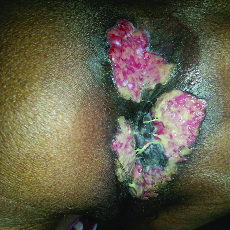 A 34-year-old housewife was on ART since seven years, presented with multiple ulcers involving perianal area with purulent discharge since two months. Patient gave history of extramarital unprotected intercourse three months back. Cutaneous examination revealed well defined, irregularly shaped ulcers with exuberant granulation tissue and purulent discharge present over apposing surfaces of perianal area [Table/Fig-4]. There was no evidence of lymphadenopathy. Differential diagnosis of donovanosis and herpetic ulcers in HIV were considered.