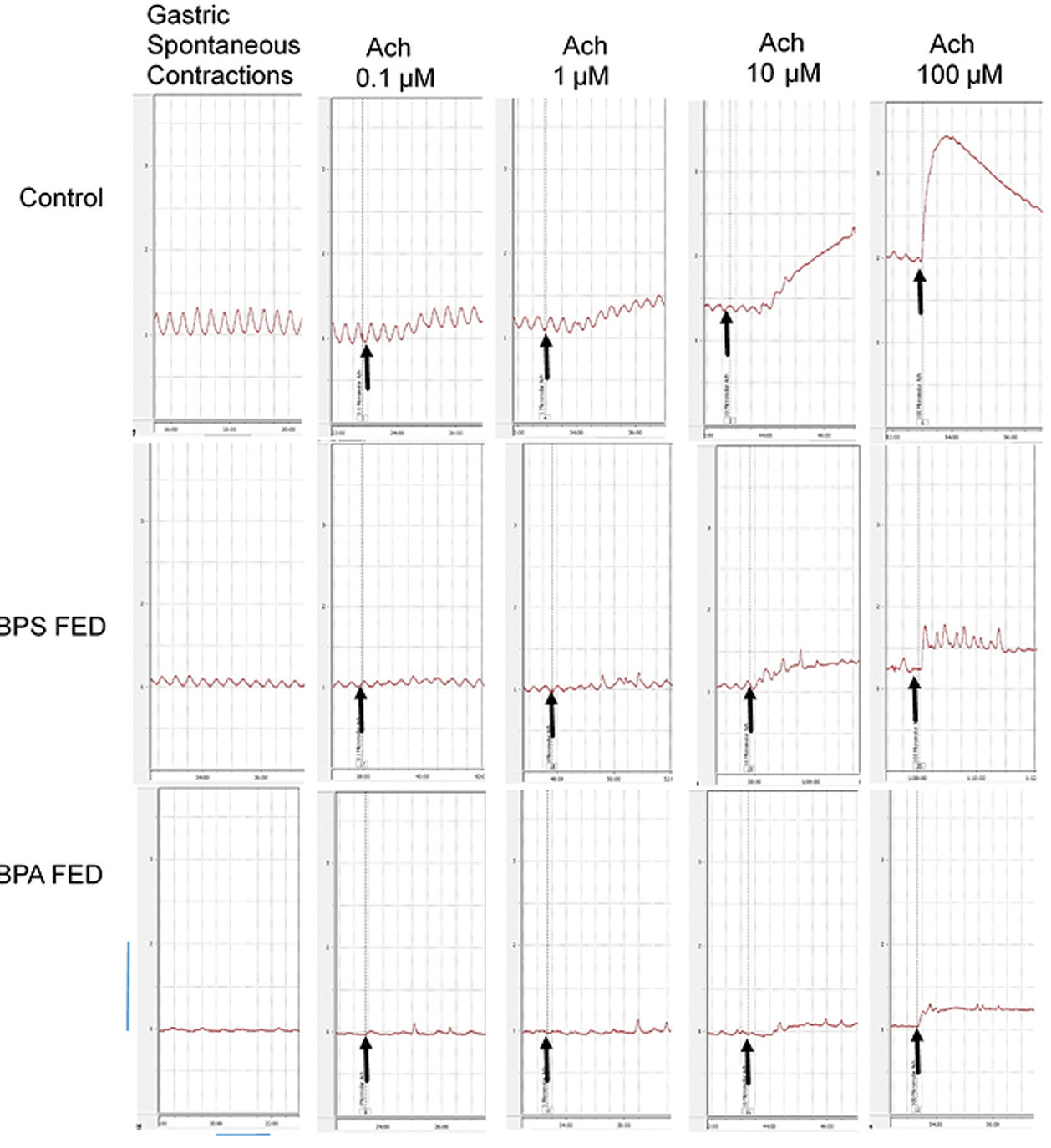 Sample of original recordings from gastric muscle strips before and after application of different bath concentrations (0.1, 1, 10 and 100 μM) of Ach in control, BPS fed and BPA fed groups.