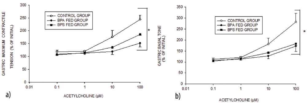 Our findings indicated that the chronic ingestion of BPA attenuated the spontaneous contractile activity and the Ach-induced contractions in small intestine as well as stomach. On the other hand, chronic ingestion of BPS inhibited spontaneous contractile activity only in intestine and not in stomach. However, the Ach-induced contractions were reduced in both intestine and stomach. There are a few studies [11-13] showing the impairment of in-vitro intestinal contractility in rats following chronic BPA ingestion. The present study for the first time demonstrated that chronic BPA ingestion may depress gastric contractility as well. Also, this is the pioneer study reporting the inhibition of contractile activity of gut smooth muscle following chronic ingestion of BPS, a substitute to BPA. The study also observed the comparative impairment of gastric and small intestinal gut contractility by BPA and BPS. The comparison of effects of BPA and BPS indicated that both BPA and BPS depressed spontaneous and Ach-induced contractions in small intestine and stomach except that BPS did not affect the spontaneous contraction in stomach significantly.