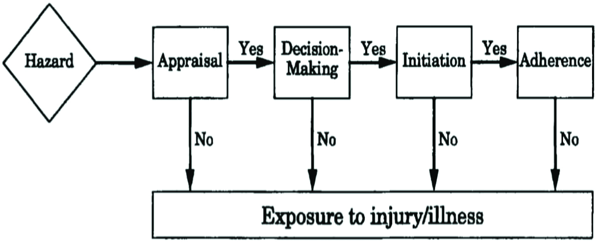 b. Decision making: Self-efficacy and cost benefits on the course of action are associated with the decision making process of workers. It perceives the benefit of action for self-protection against the cost. The cost is considered as a reduction of productivity, skill performance, time constraints, physical discomfort and some other factors related to a reduction in the quality of life on their work. In this stage, condition of the workplace like availability of safety equipment, training for the proper utilisation of equipment and redesign of the job make more effective and self-protective for the working population. It is promoted to develop education, skill building exercise, and training programme among the working population which is considered to the safety climate [40].