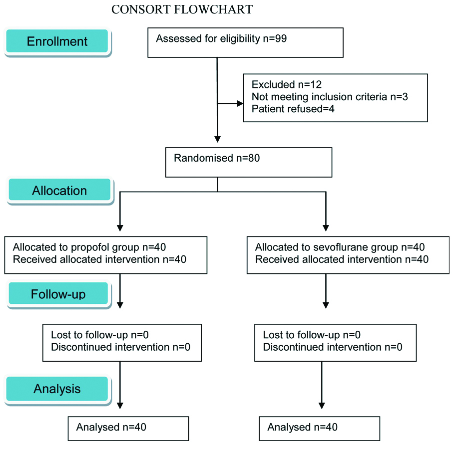 The selected patients were randomly divided into two groups by computer generated randomised number and then by picking sealed envelope and divided into two groups of 40 patients each to receive propofol infusion (Group A) or sevoflurane inhalation (Group B) for maintenance of anaesthesia.