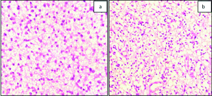 a) Diffuse astrocytoma (WHO grade II): Photomicrograph showing diffusely arranged monomorphic astrocytes lying over a fibrillary background (H&E x200); b) Oligodendroglioma (WHO grade II): Photomicrograph showing uniform oligodendroglial cells displaying fried egg appearance (H&E x200).