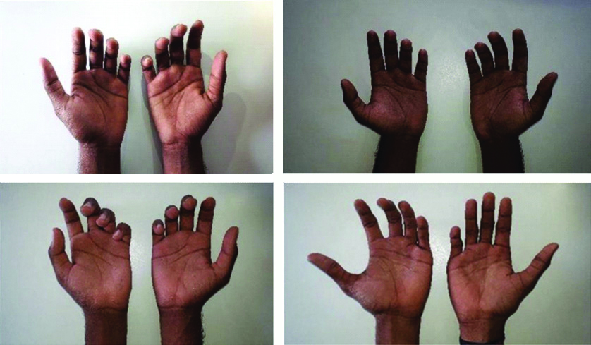 The primary outcome tool included measuring the resting ROM of Metacarpophalangeal (MCP), Proximal Interphalangeal (PIP) and Distal Interphalangeal (DIP) joints both dominant and non-dominant hand using goniometer. The secondary outcome measure was recorded using the composite finger flexion method, which assesses finger ROM, measured as the distance from the fingertip to a fixed point in the palm, using a ruler. The subject attempted to make a fist. Composite finger flexion is a quick, simple and cheap method and provides a measure which both therapist and patients can use as an indicator of progress. This measurement gives an approximation of the total digital motion in flexion and is more comprehensible to most individuals than motion measured in degrees. Centimeters were used to record the distance with zero indicating full flexion to the distal palmar crease [9,10].