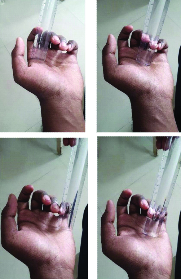 Composite finger flexion of all the four digits was measured for each hand using a geometric ruler. The position of the subject and the therapist was followed as the same as for goniometry measurement. A geometric ruler was placed perpendicular to the palm at the level of the distal palmar crease such that the end of the ruler marked 0 cm corresponded to the palmar crease and the marking on the ruler that corresponded to the tip of the index finger was noted down as 2nd digit. Similarly, the 3rd, 4th, and 5th digits were measured [Table/Fig-3].