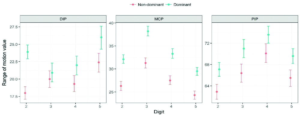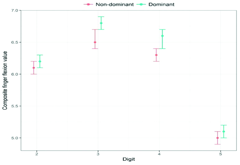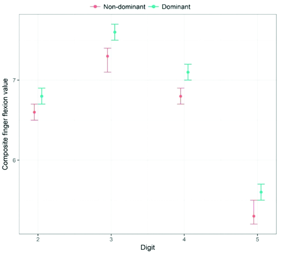 The demographic information of the participants is compared between power grip and non-power grip groups by descriptive statistics like mean and standard deviation in case of continuous data or frequency and percentage for categorical data. The ROM values and composite figure flexion values are summarised by mean and SD within each of power grip and non-power grip groups. The normal values for each of the sub categories are estimated by mean with its 95% confidence interval. The confidence intervals were compared across different sub categories. The pairwise mutually exclusive confidence intervals were considered to be significantly different form each other else insignificant statistically. The p-values from paired and unpaired t-test were also obtained in case of comparison of the features within and between the participants respectively. The results were visualised by error bars. The data was entered in excel and analysed by statistical software R version 3.5.1.
