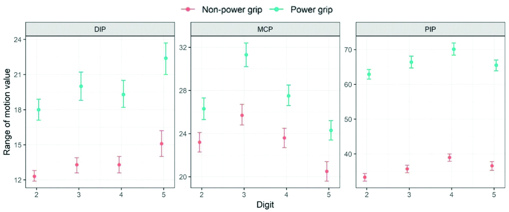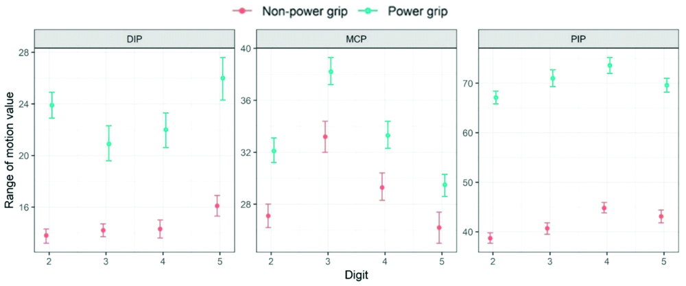 Range of motion values of finger flexion cascade in power grip users (graph).