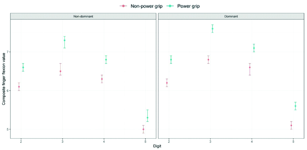 Comparison of composite finger flexion values between power grip users and non-power grip users in non-dominant and dominant hand (graph).