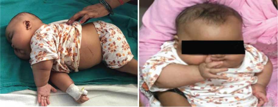 A six-month-old child with birth weight 2.6 kg presented to our hospital with phenotypic features of down syndrome [Table/Fig-1,2] and recurrent episodes of noisy breathing since two months of age. There was no history of maternal hypertension/ drug intake/diabetes mellitus or any significant antenatal history. The child history revealed that he had been on oral prednisolone since the age of two months when he first visited to private practitioner, where he was prescribed steroid prednisolone at 2 mg/kg of body weight which patient took for four months before he presented to us. This drug was prescribed in view of diagnosis of Bronchial Asthma made by the private practitioner. No mention of Down syndrome was made to attendants outside and this diagnosis of down syndrome was made at our hospital. Further investigations including karyotyping confirmed chromosomal picture of 47, XY+ 21 which was consistent with down syndrome.