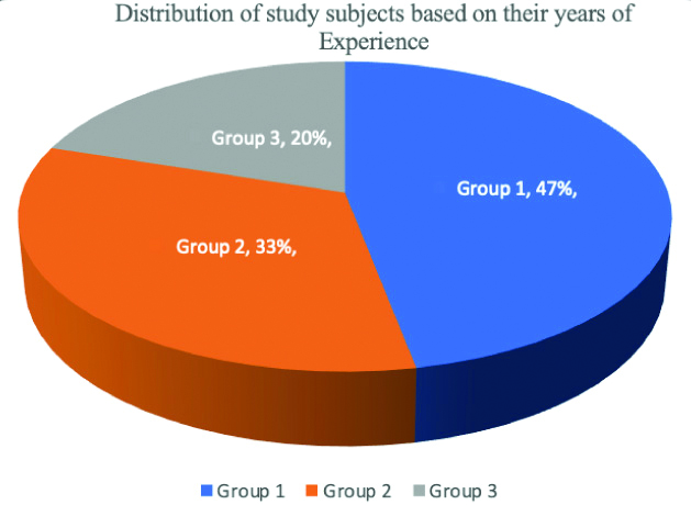 A total of 200 prosthodontic faculty members responded, out of which 47% (94/200) respondents had a teaching experience of 2 to 7 years and were categorised as Group 1, whereas 33% (66/200) with a teaching experience of 7 to 12 years were assigned to Group 2. Finally, 20% (40/200) of faculty with teaching experience of greater than 12 years were allotted to Group 3 [Table/Fig-2].