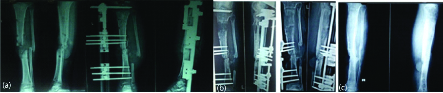 Preoperative (a), postoperative (b) and final X-ray images (c) of infected non-union tibia with bone loss treated with LRS and bone transport.